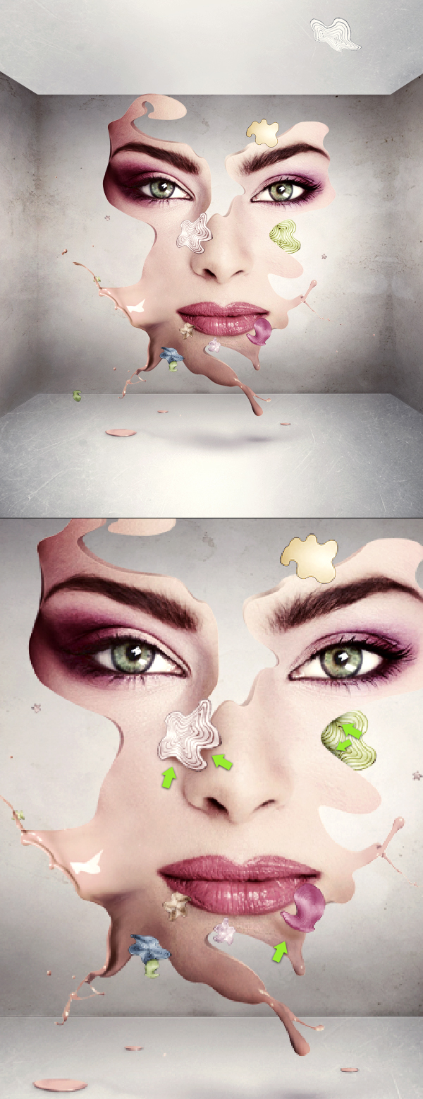 OK, we can start adding some more drawn elements. So in the first image below, the orange arrows indicate spots that I actually wanted to burn with the Burn Tool (set to Midtones), and the green ones indicate spots that needed some more light (use the Dodge Tool set to Highlights). As you can see, the proper use of simple tools can make your elements really shape up.