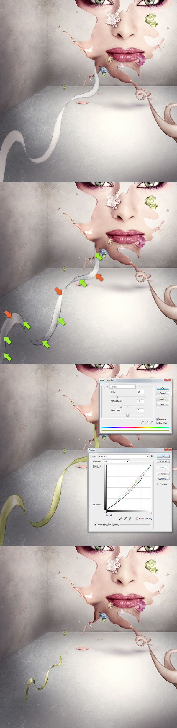 OK, now again repeat the previous step by adding another element. Then using the same tools (Burn/Dodge) make the element shape up (second image below). Next in the third image below (when colorizing) you can use a few layer adjustments to make it look better. In this case I went for Hue/Saturation and Curves to give a nice yellowish green tone.