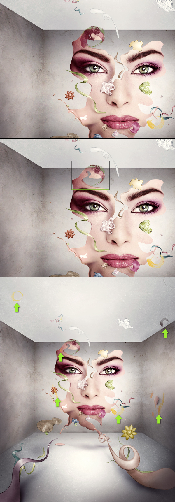 Next I wanted to add some depth to this piece by making it less plane. To do this you need the Burn Tool and Dodge Tool. In the third image below, the green arrows indicate the lower spots (that need to get painted using the Burn Tool set to Midtones) and the red arrows indicate the upper spots (that need to get painted with the Dodge Tool set to Highlights).