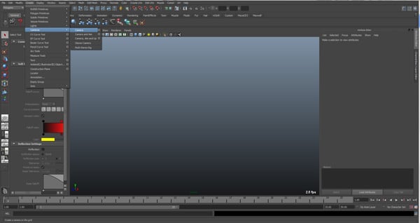 Create a camera in Maya. To do this click Create in your top tool bar then go down to Cameras and finally click Camera.