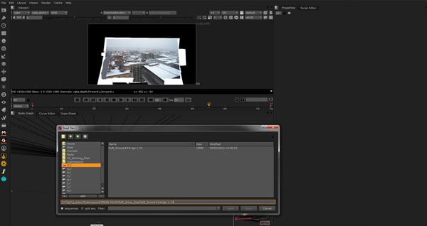 In order to add the snow to my scene I first found royalty free stock footage of snow on Youtube with movement that I liked that had also been shot against black. We now need to get our footage into our 3D scene. So that we can place the snow around much like a theater set. (It is important to convert your snow footage into an image sequence to be sure that it loads sufficiently in Nuke.)