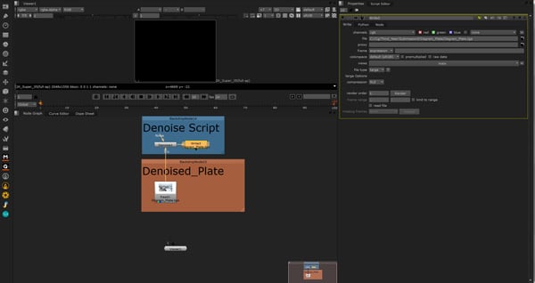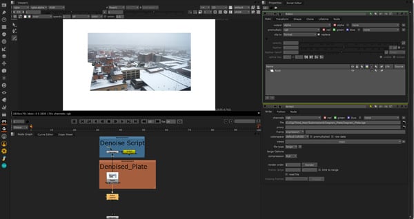The Denoise node is a heavy node which means that it takes a lot of computer power to work. So in order to help this, we render out our degrained version and disable the Denoise node. Select the Denoise node, hit TAB and type Write and then press Enter.