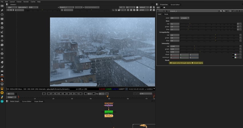 This node will apply grain uniformly over the whole image without our alpha, so make sure that the Apply Only Through Alpha option is ticked, as well as Invert Alpha in order to increase the amount of grain in the dark areas. Again adjust the settings of your keyer to get your desired effect.