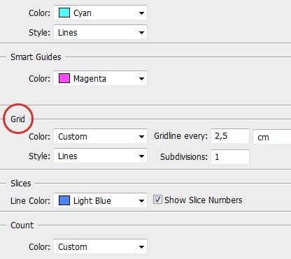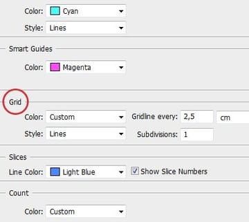 Now let's start planning the layout of the design. In order to create a basic grid that we'll begin with, go to Edit > Preferences > Guides, Grid, Slices, and Count. Look up the Grid section, and make sure that your grid is divided by 2,5 cm with a single subdivision. You may also need to make it visible by going to View > Show > Grid.