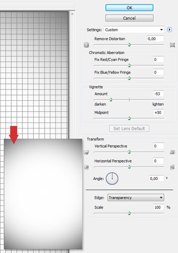 It's time to begin the damage and distortion. Create a new layer above all others and fill it with white. Go to Filter > Distort > Lens Correction. Alter the Vignette settings and drag it down to about -50 or -60. Set the layer's blending mode to Multiply.