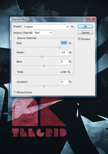 And now, a subtle alteration of color. We'll brighten up the red just a notch, through a Channel Mixer (Layer > New Adjustment Layer > Channel Mixer). Use the settings found in the following image.