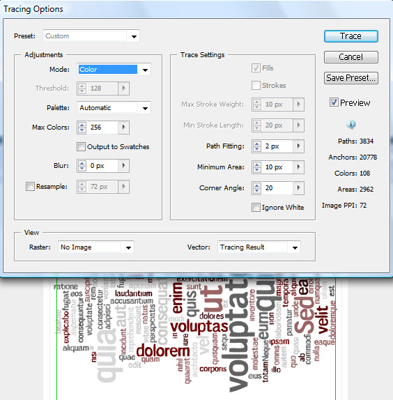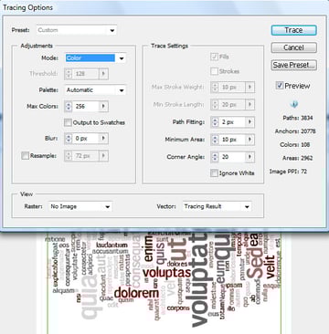 Now we're going to Live Trace this into a sketchy style type treatment. So take a screen shot of the cloud, and paste it (Command + V) into a new Illustrator file. Once again, you'll need Illustrator in order to Live Trace an object. Go to Object > Live Trace > Tracing Options. Use Color and 256 colors. If you're looking for a more precise execution, adjust the settings found in the menu.