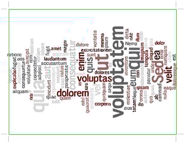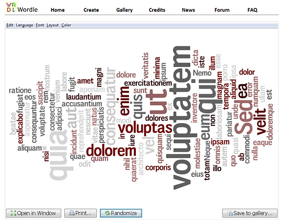We're going to give the letters a texture now. The texture will be made by a word cloud using Lorem Ipsum text, which is closely associated to graphic design. You can make your own cloud, or use this really nifty online tool called Wordle. It's a word cloud generator, and it's what I used here. Head over to their site and click on the Create button. Paste in some dummy text and generate a cloud. Keep randomizing until you find the best shape, and select Telephoto as a font, and Heat as the color selection. You can change these settings using the buttons you'll find above the cloud.