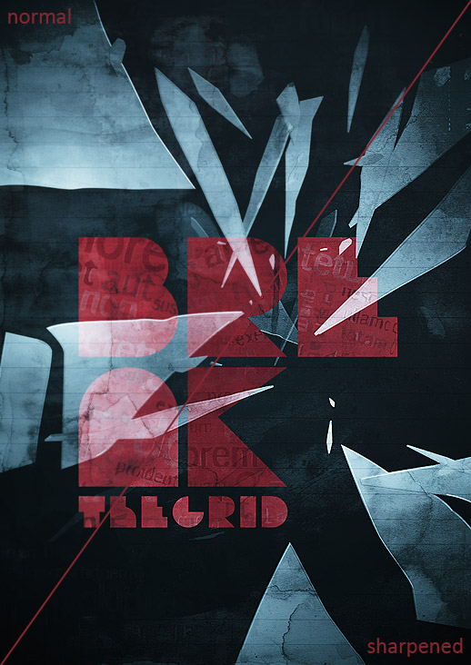 Also, when sharpening grunge, you can get some pretty spectacular results, because Photoshop basically creates subtle bevels. Look at the letters below: Do you notice how the sharpened red letters seem to have a one pixel bevel? Well, it's from sharpening.