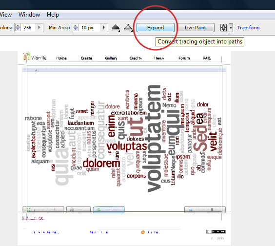 In order to trim off the excess elements, like the web interface and white background, you'll need to Expand the newly live traced object. Press the Expand button; you'll see it once you have the object selected.