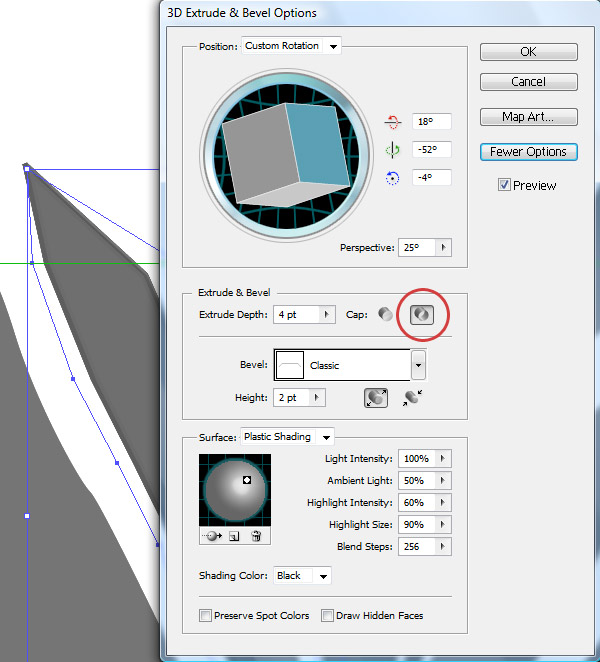 Once you turn it into a 3D object, copy the object and paste it in its exact position (Command + F). Find your Appearance Panel under Window > Appearance and double click on the 3D Extrude & Bevel effect listed there. That will open up the current 3D effect that you have over the glass piece. With this one, only change the Turn Cap On to Turn Cap In. This will simulate a transparency effect by revealing the inner edge too.