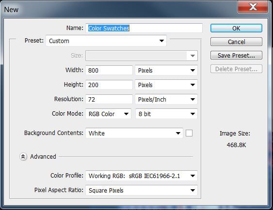 Hit Control-N and create a New Document of 800 x 200 pixels, in RGB Color Mode at 72 Pixels/Inch. Name it Color Swatches.
