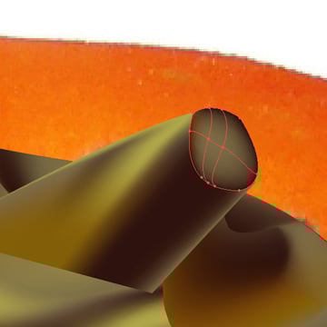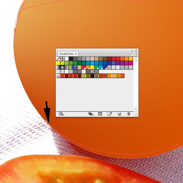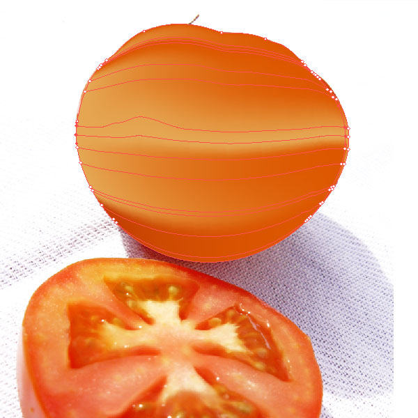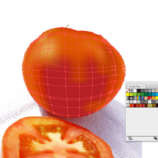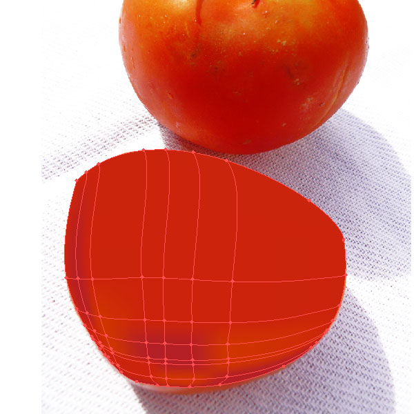 Let's have a look at the cut tomato. It's slightly more difficult, but we'll use some tricks to help us out. Create yet another shape around the cut tomato with the Pen Tool (P) and fill it with a red. Then start adding mesh lines just like we did earlier. Place shadows and highlight points and some midtones.