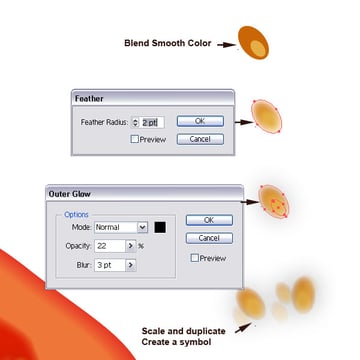 Let's move on to the seeds. I outlined a neat trick to create them fast, shown below. Make two ellipse shapes, one bigger than the other. Choose beige to green colors and apply a blend. Then add the feather effect. After that, apply an Outer Glow. Then duplicate the shape and scale it down or up. Set some of them to a lower Opacity setting. Then group them and drag them into the Symbol Palette. Now you can add some seeds to the cut tomato with the Symbol Sprayer.