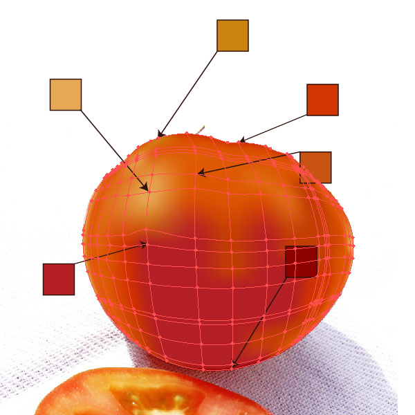 Now we can move on to add some vertical mesh lines. Take a look at the tomato and study the highlights and shadows.