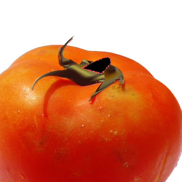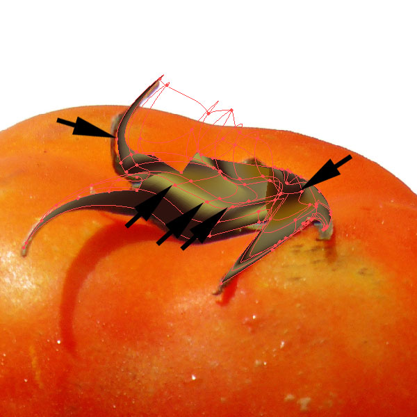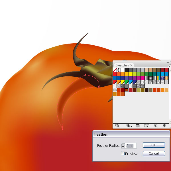 Once you zoom out, the stem looks quite good. Group the stem parts and place them on top of the mesh tomato. But hey, we forgot something. The stem will look much better with a shadow falling onto the tomato. Create a shape like you see in the image below and fill it with a red. Then apply a Feather Effect of 3pt. Place the shape underneath the stem parts. This will simulate a shadow falling onto the tomato.