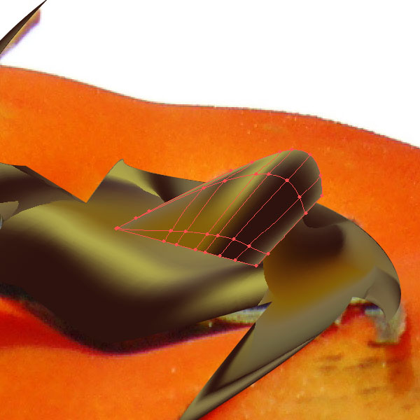 Place another mesh line just a bit below the previous one. Select again the outer left mesh point and fill it with the red-orange from the original shape.