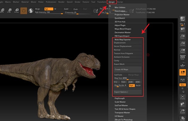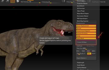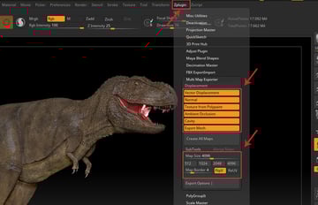 With the Dino mesh selected, click on Zplugin menu in main menu bar to open the Multi Map Exporter panel as shown in the following image.