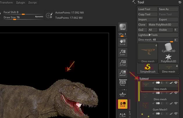 Select Dino mesh in the SubTool panel as shown in the following image.