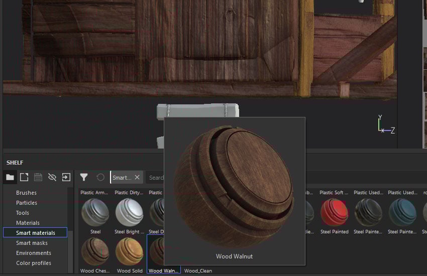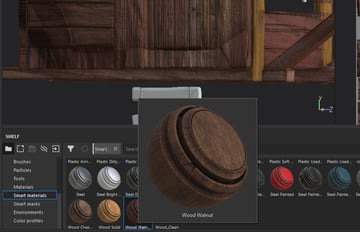 Continuing on from the last part of the tutorial series, go to Smart Material shelf, drag and drop Wood Walnut material into Layers. Add a black mask, fill the colour for staircases.