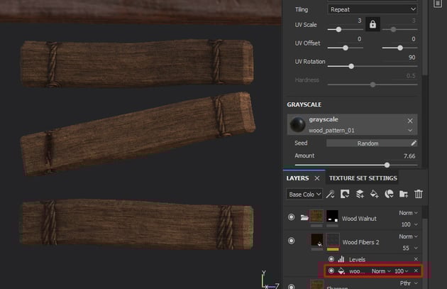 and select Wood Fibers 2 masking > select wood_pattern_01 > rotate 90º.