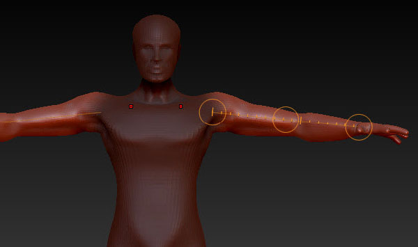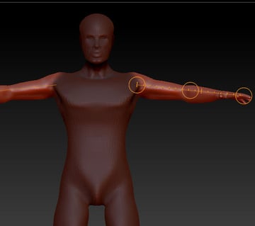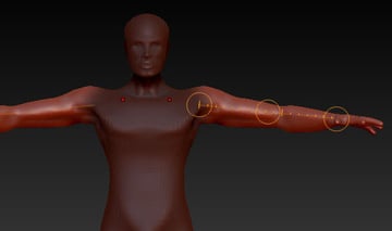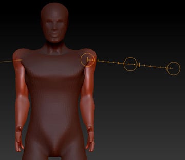 Insert another Zsphere into the chain for the elbow, and adjust it using the Move and Scale tools (to shape the arm.)