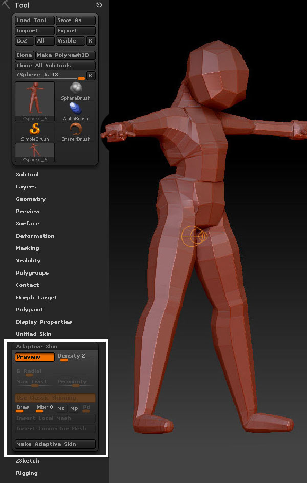 You can preview the mesh by pressing ‘A’ on the keyboard. Or by pressing the "Preview" button in the "Adaptive Skin" options of the Tool menu. You can see we have a problem where the arms and legs connect to the torso.