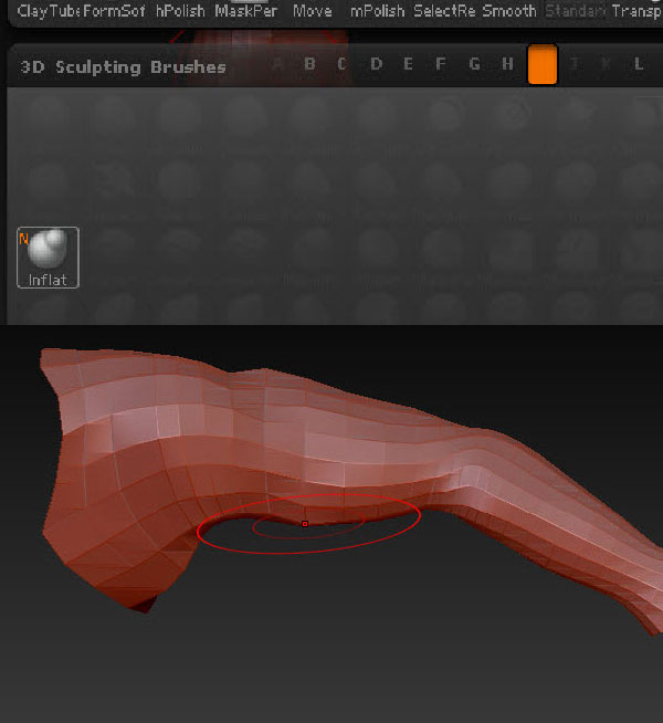 Select the "Inflate" brush from the "3D Sculpting Brushes" menu, and inflate the mesh where required (as shown in the following images.)