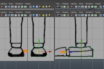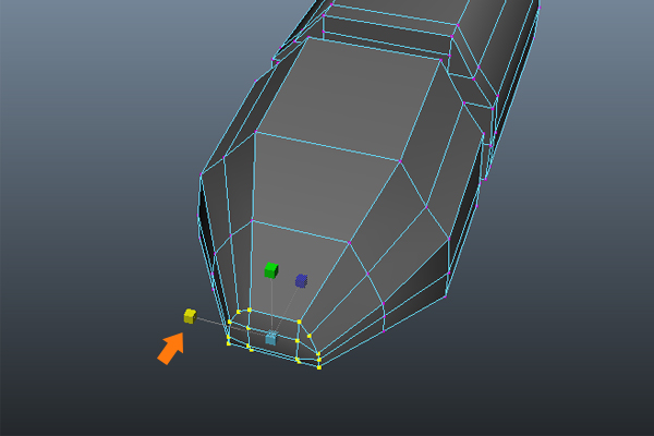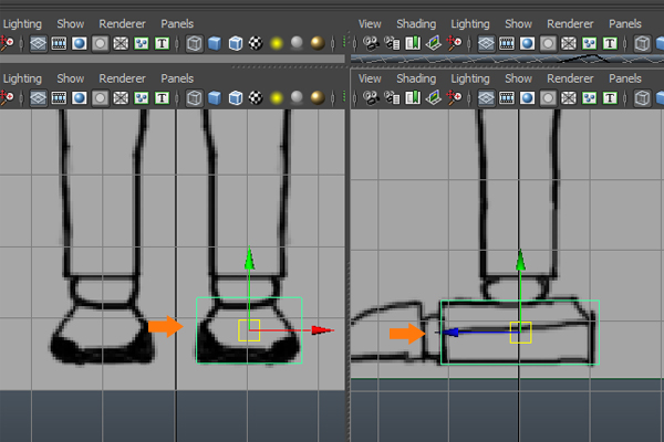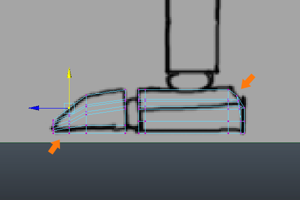 Back in the Perspective view, select the Verticies around the foot's tip and Scale them down them on the X-axis, as shown in the image.