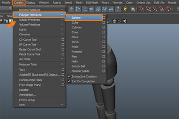 Now, we'll make the ball joint which will control the rotation of that body part. So go to Create menu and select Sphere, from inside the Polygon Primitives submenu.