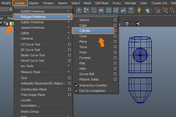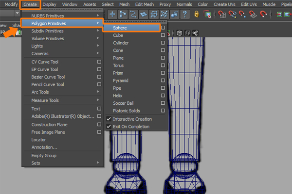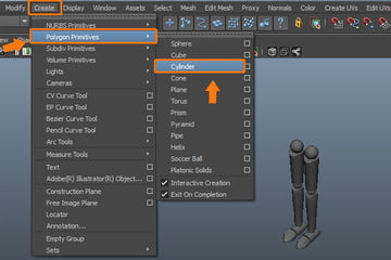 Let’s move ahead and model the leg and knee parts. So, go to Create menu and select Cylinder, from inside Polygon Primitives submenu.