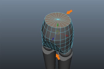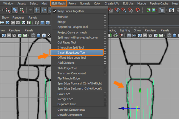 Now, go to the Edit Mesh menu and select the Insert Edge Loop Tool. Insert several edge loops to the cylindrical leg as shown in the image.