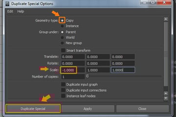 In the Duplicate Special Options window, check on the Copy radio button and set the X-axis Scale to a value of -1.000, then click on the Duplicate Special button.