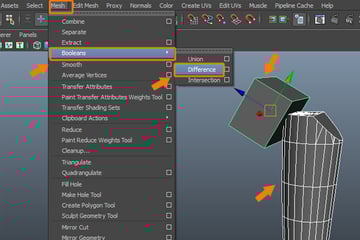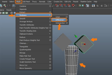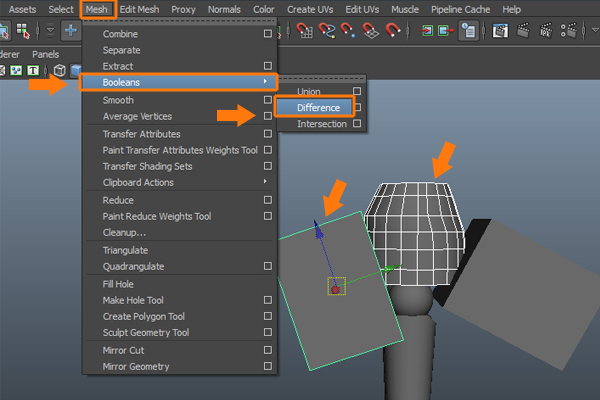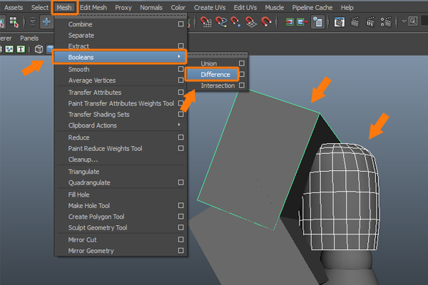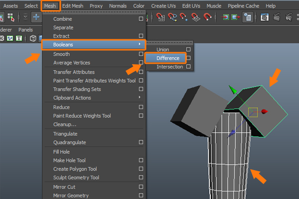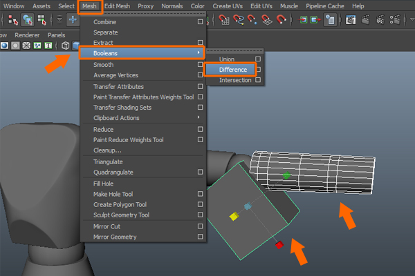 Now, first select the cylinder and then the left cube and go to the Mesh menu. And select the Difference command from inside the Booleans submenu.