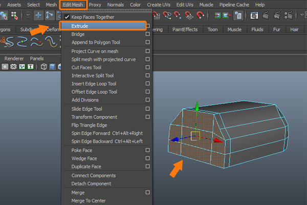 While in the Perspective view, press the F11 key to change to Face selection mode and select the front faces of the cube. Then go to the Edit Mesh menu, and select the Extrude command to extrude the selected faces.