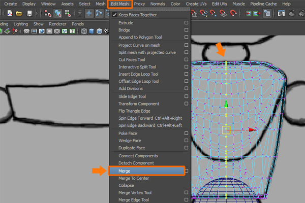 After combining both chest parts together, press F9 to jump into Vertex selection mode. Then with the center vertices selected, go to the Edit Mesh menu and select the Merge command again, to merge the selected vertices.
