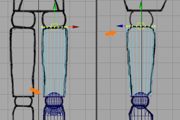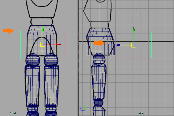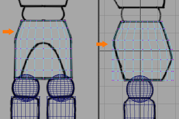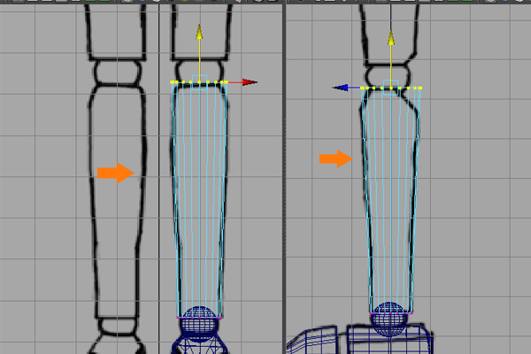 With the thigh object selected, press F9 for Vertex selection mode and then arrange the vertices according to the basic thigh shape.