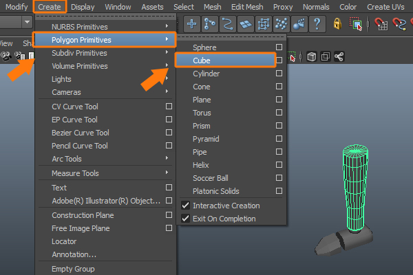 Now, we'll start modeling the foot of the character. So, go to the Create menu and click on Cube inside the Polygon Primitives submenu.
