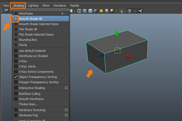 Now, jump into the Perspective view and focus on the cube. If you can’t see the cube in shaded mode, then either press 5 on the keyboard, or go to the Shading menu (in the view panel), and check on the Smooth Shade All option, to see the object in Shaded mode.