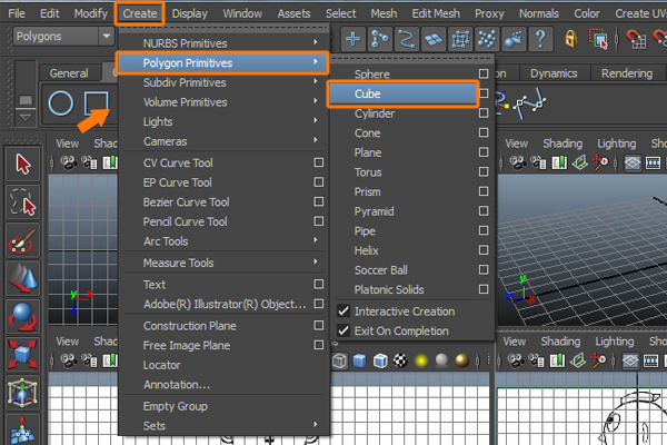 Next, go to the Create menu and select Cube, from inside the Polygon Primitives submenu.