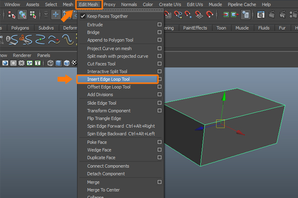 We need to add more subdivision to the created polygon cube. So, with the cube selected, go to the Edit Mesh menu and select the Insert Edge Loop Tool.