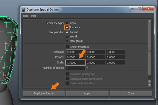 In the Duplicate Special options box, check on the Instance radio button and then enter a value of -1.000 for the X Scale. Then click on the Duplicate Special button, to apply and close the Duplicate Special Options.