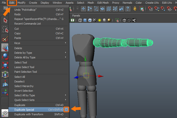 With the arm group selected, go to the Edit menu and click on the Duplicate Special option box.