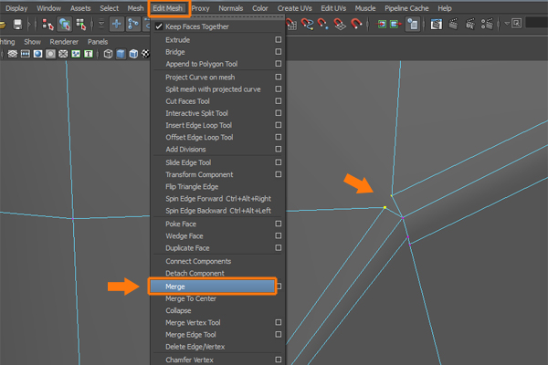 If you look closely, we need to merge several vertices together. So press F9 for Vertex selection mode, and select the corresponding vertices. Then go to the Edit Mesh menu and select the Merge command, to merge the selected vertices.