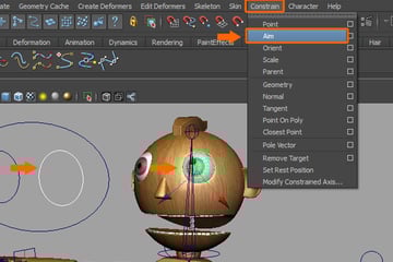 Next, we will apply an aim constraint to the eyeballs. So first select the Left_Eye_Control and then select the left eye ball mesh, and go to the Constrain menu and choose the Aim constrain command.