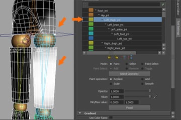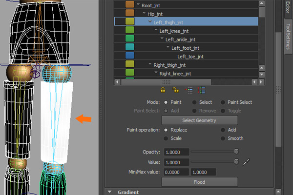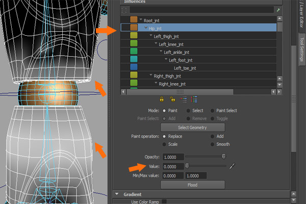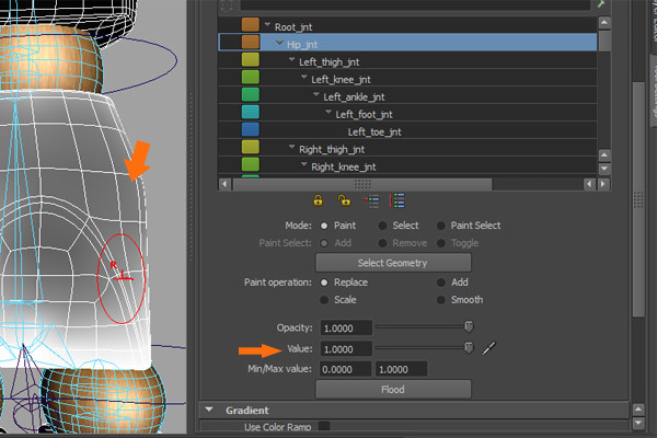 Now with the Hip_jnt joint selected, let’s increase the skin weight on the hip mesh. So this time we will keep the value of the Value field set as 1, which means a 100% value.