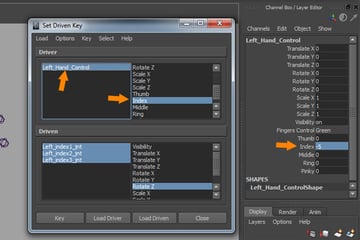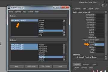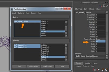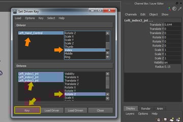 Select the Left_Hand_Control and Index attribute in the Driver group, and then select all the index joints and Rotate Z axis in the Driven group and then click on the Key button to add the initial key.