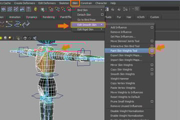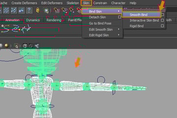 With the meshes and the skeleton’s root joint selected, go to the Skin menu and select the Smooth Bind command, from inside the Bind Skin submenu to apply skinning.