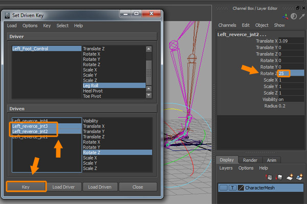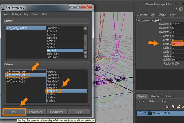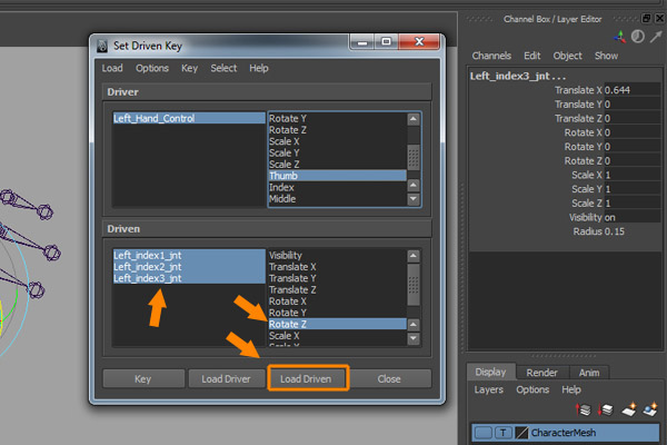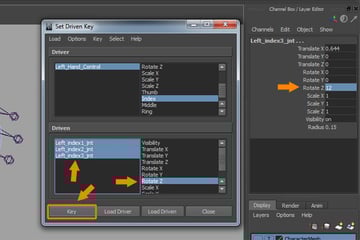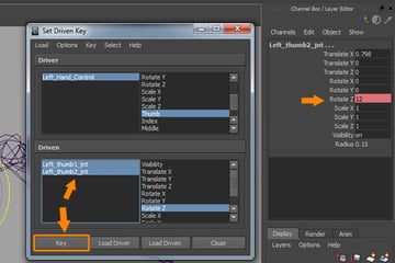Now with all the Index joints selected in the Driven group, set the Rotate Z value to 12 and then click on Key.