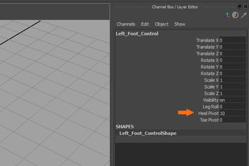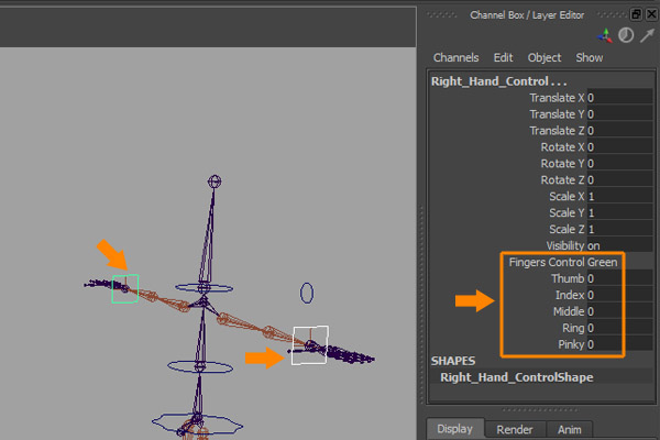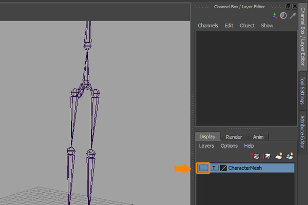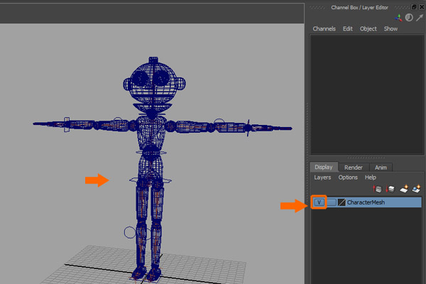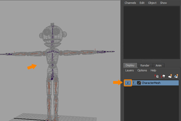 Now we will start creating the control curves. This time we need to unhide the character mesh, so that we can make and see the controls outside of the meshes. So we need to click on the Visible button in the Display group, inside the channel editor panel.